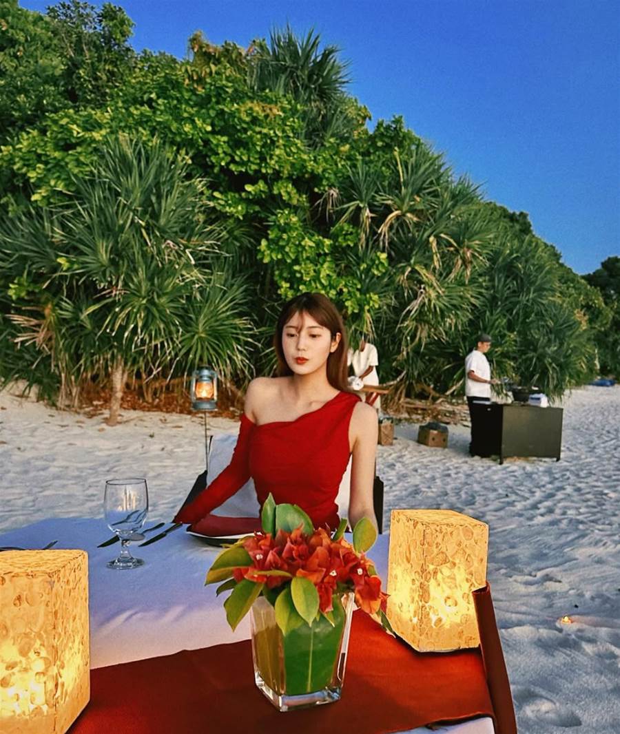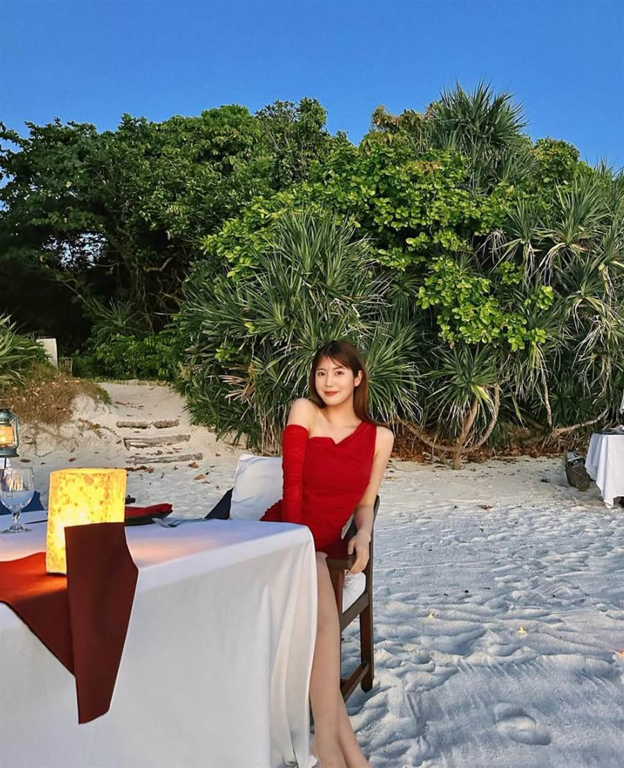 🤍🍽🥂ビーチで魅せる赤いドレスが華やか!リラックスした笑顔と完璧なコーデが素敵すぎる✨